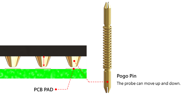 Pogo Pin探針內含彈簧結構,能在 IC 與測試治具之間提供穩定接觸力,補償焊盤高度與間距公差,適合高重複性和精密測試。
